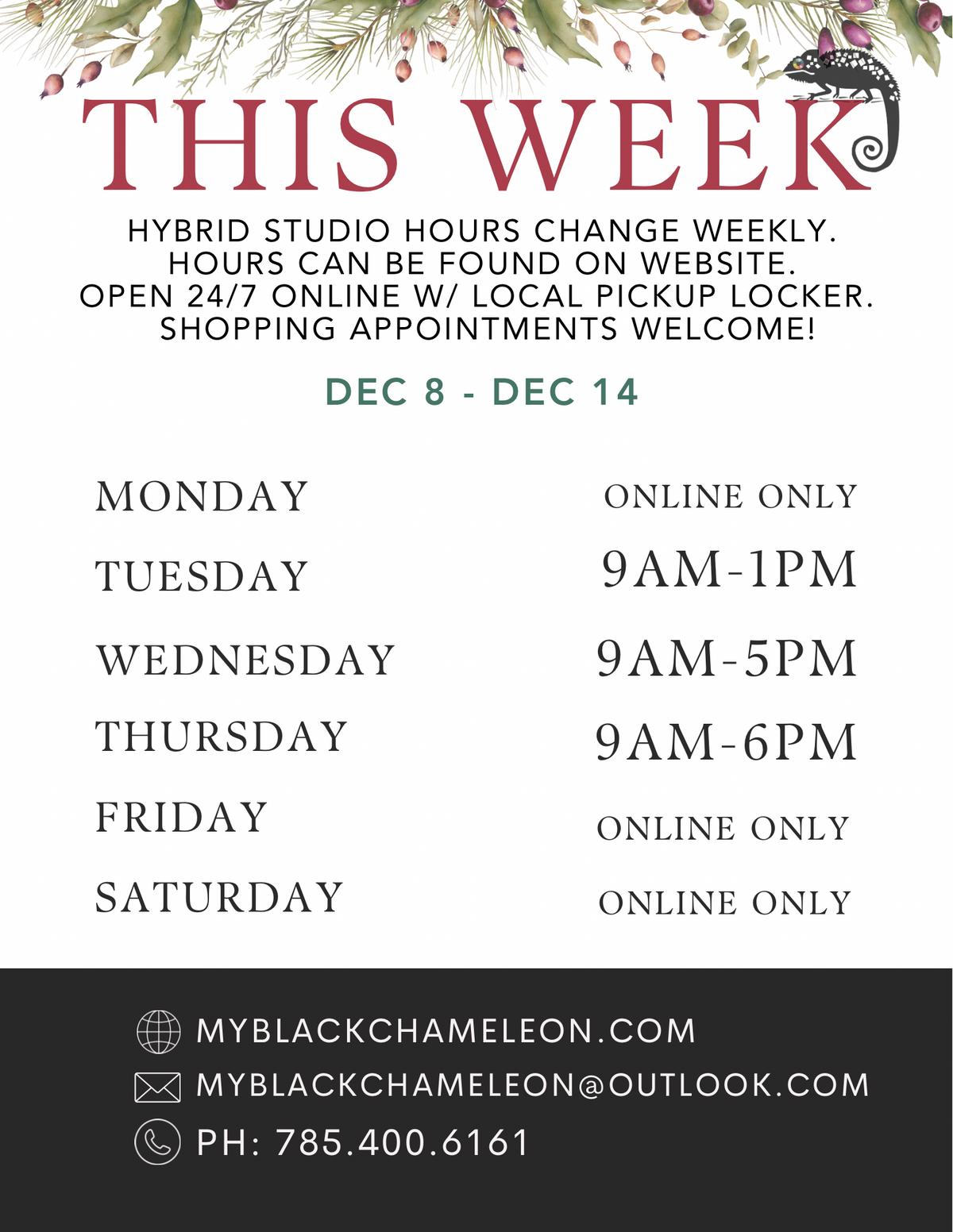 Our in-store shopping hours change weekly. If you're local and would like to experience Black Chameleon in-store you will find our weekly shopping times here. (updated every Sunday)