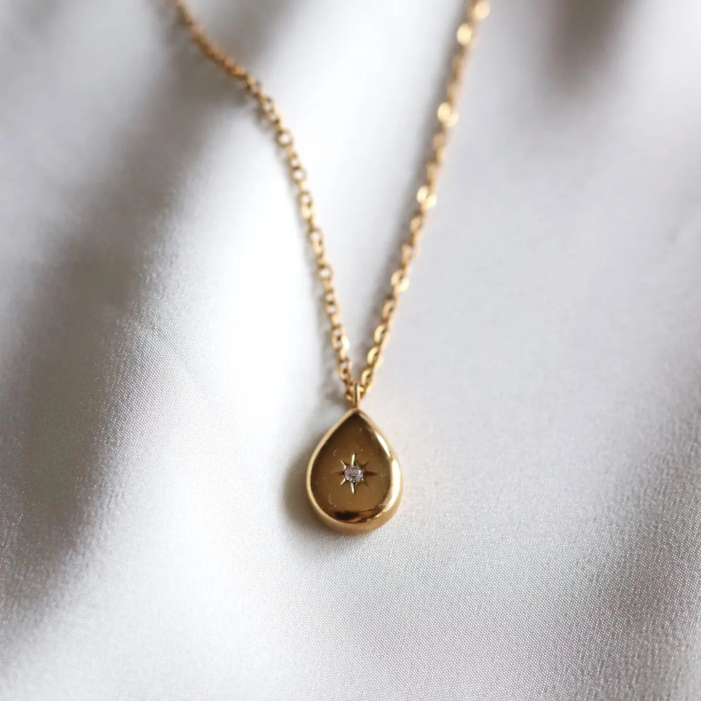 North Star Necklace will be your new go to piece! Adorned with a delicate CZ diamond, this 18K gold plated necklace is perfect for layering or along.